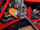 | Die spiralförmig belüftete Bremsscheibe ist vom BMW M3 und auf 300mm Durchmesser abgedreht. Der Distanzring kommt zwischen Radnabe und Bremsscheibe. Die Brembo 4-Kolben Monoblock Bremszange stammt vom Porsche Chayenne. Die 2. Zange (6-Kolben) von Tocico. | |||||