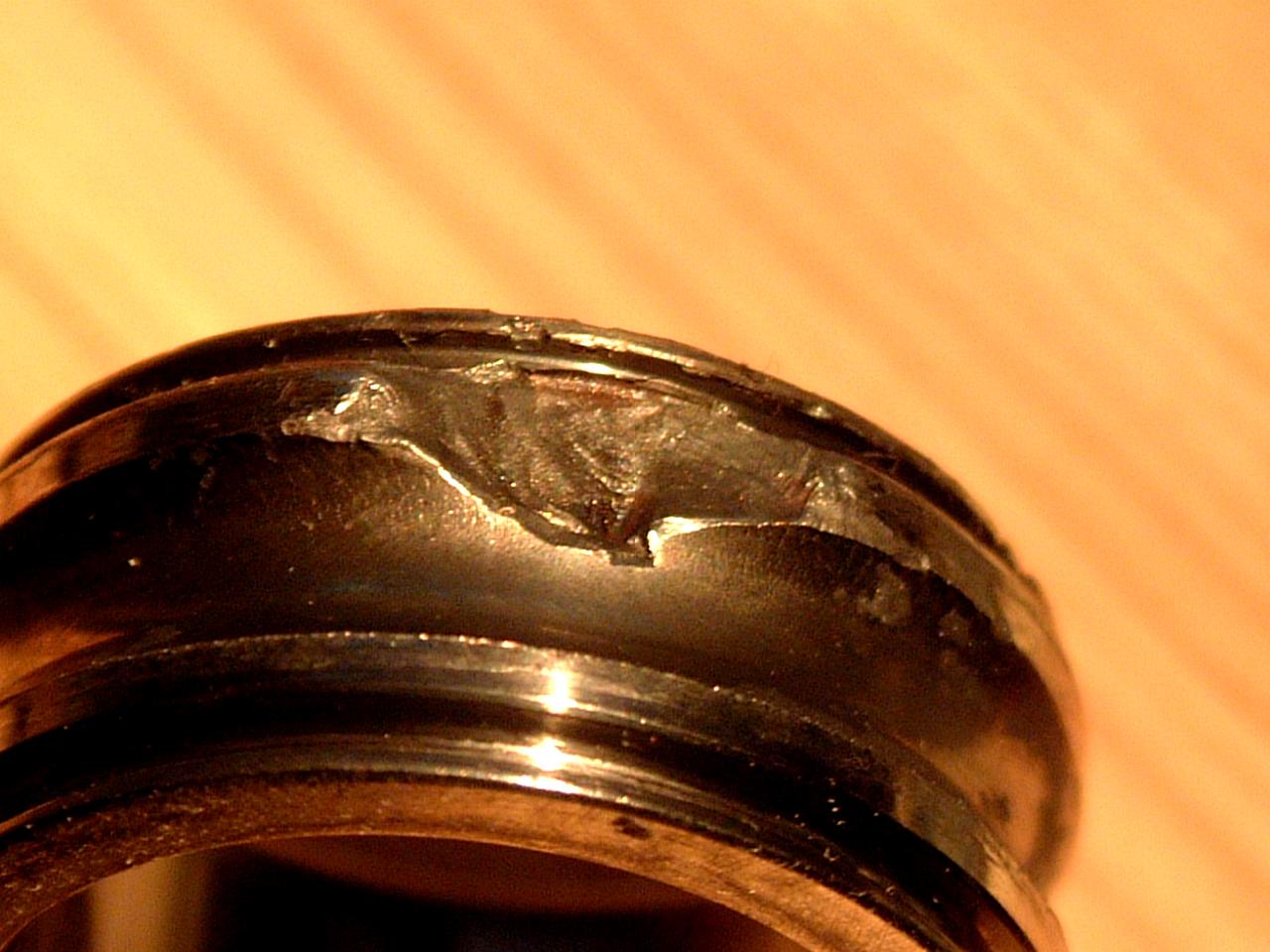 Ausbruch an der Laufbahnflanke durch zu hohe axiale Belastung. |